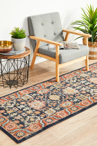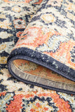 Raise the bar of your floors with this eye-catching area rug, showcasing a Persian-inspired motif with a botanical border. Touch of tangerine, cherry and orange stand out against a dark blue center for a splash of color, while subtle striations and distressed details dot the design for a well-worn look. Machine-woven in Turkey from 100% polypropylene, this durable piece is an ideal base for a busy space since its designed to hold up to high-traffic. Plus, its easy to clean with regular vacuuming thanks to a low 10mm pile height.