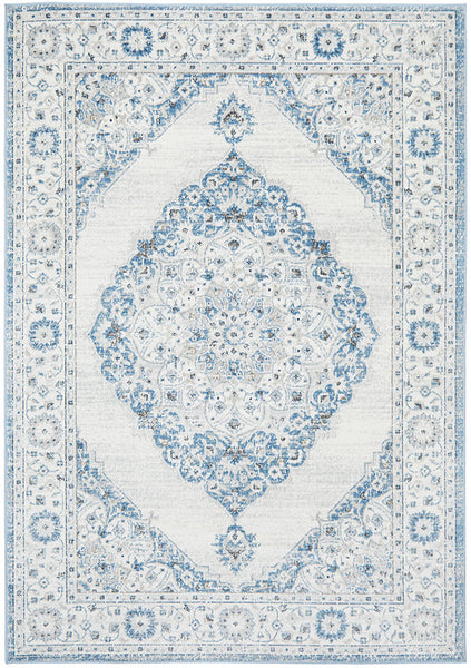 Emotion is a truly stunning statement rug with it's gorgeous off-white, soft-grey, and cornflower blue hues. Featuring an intricate diamond emblem design and decorative floral arrangements, the Emotion is a stunning centrepiece that will give any interior a charming bohemian warmth.